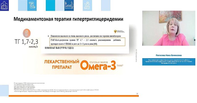 Заместитель генерального директора по научной работе и профилактической кардиологии «НМИЦ кардиологии им. академика Е.И. Чазова» Минздрава России Нана Погосова отметила, что повышенный уровень триглицеридов имеет каждый третий человек в популяции. Это также увеличивает риск коронарных событий, даже если у пациента имеется достигнутый уровень ХС ЛПНП. Кроме того, она обратила внимание на еще одну важную когорту пациентов — с хронической болезнью почек (ХБП). «При утяжелении заболевания почек риск гипертриглицеридемии возрастает в 2,5 раза, а повышенный уровень триглицеридов связан с риском смерти на всех стадиях ХБП. Было много исследований, которые показали, что снижение уровня триглицеридов на 1 ммоль/л при помощи различных препаратов приводит к снижению риска больших острых нежелательных событий на 54%. Это очень важно», — сказала эксперт. Она также добавила, что в качестве медикаментозной терапии гипертриглицеридемии используется достаточно безобидный, но эффективный препарат Омега-3 ПНЖК. «Прием такого препарата действительно снижает уровень триглицеридов. Целесообразно рекомендовать его пациентам с ХБП, у которых уровень триглицеридов более 1,7 ммоль/л», — завершила она.